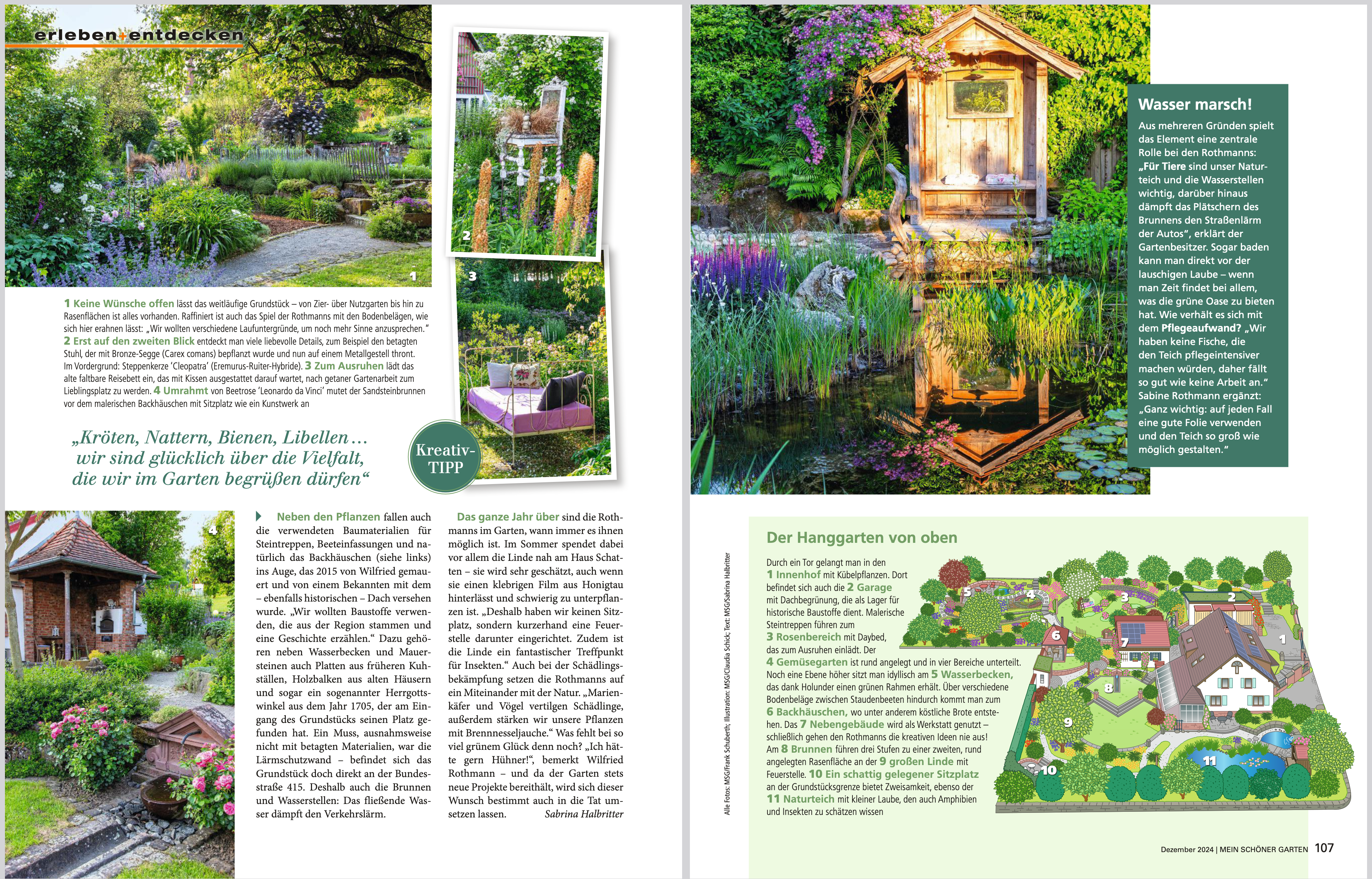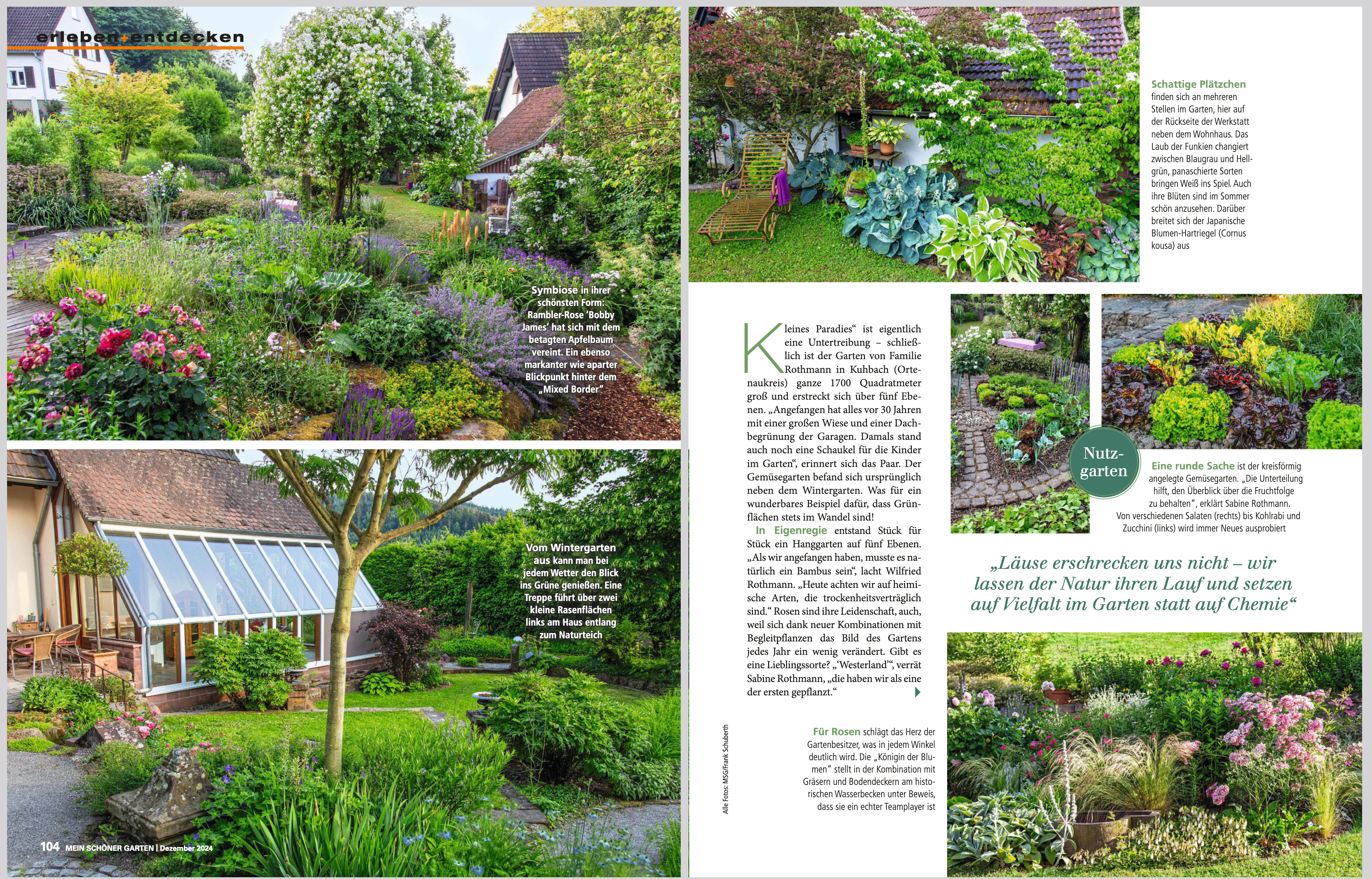 Die Vielfältigkeit von Rosen zeigt sich in diesem Garten besonders schön. Angefangen von den Seerosen auf dem Teich über verschiedene Pfingstrosen bis hin zu ganz alten Sorte der Rose de Resht, deren purpurfarben gefüllte Blüten einen betörenden Duft verströmen, oder der Rambler-Rose, die sich mit einem Apfelbaum vereint hat und in einer interessanten Symbiose einen scheinbar ständig weiß blühenden Obstbaum bildet, reicht die Palette im Garten der Rothmanns. Ganz romantisch unter dem Apfel-Rosenbaum steht ein Bett mit Metallgestell und wirkt auf den Gast so richtig einladend.
