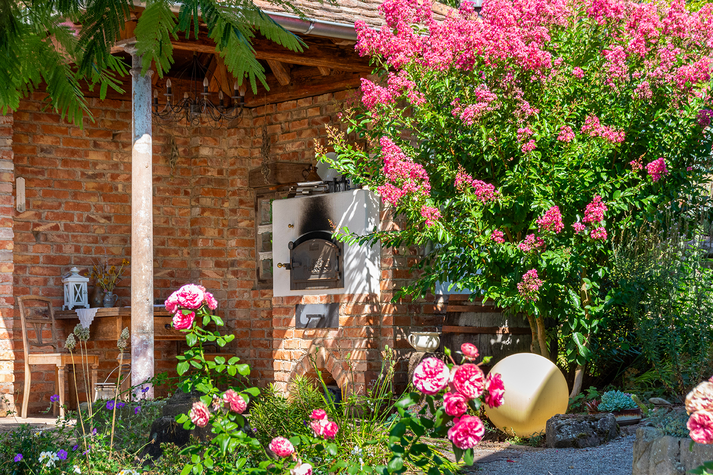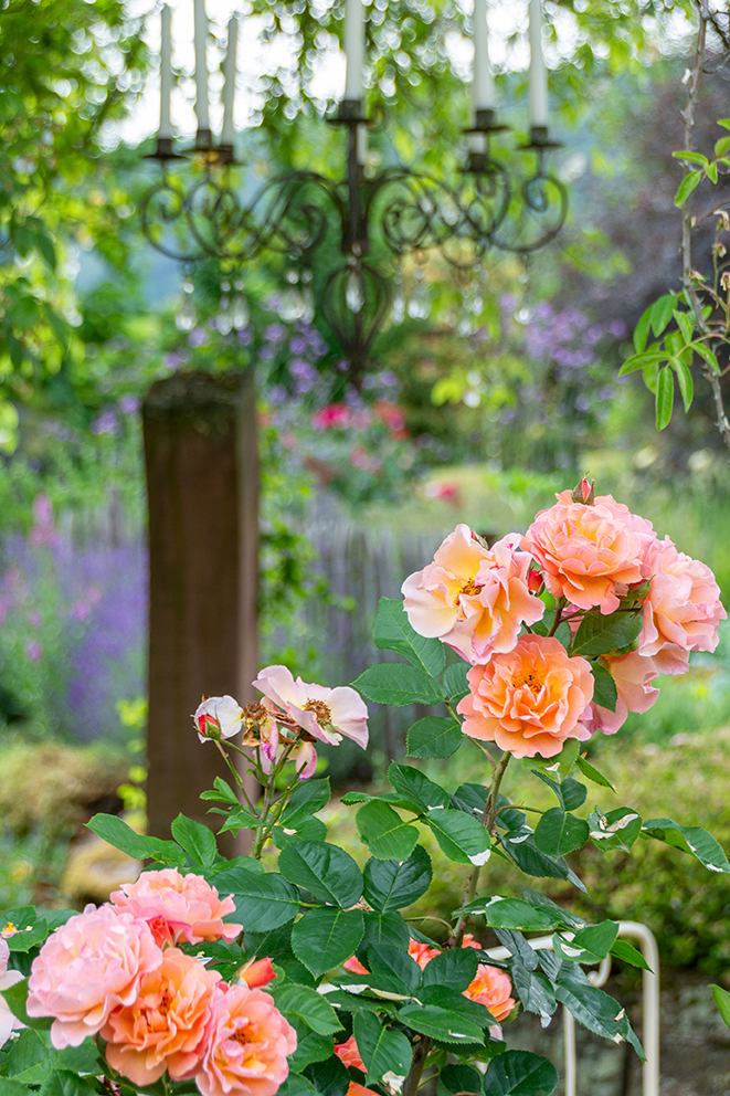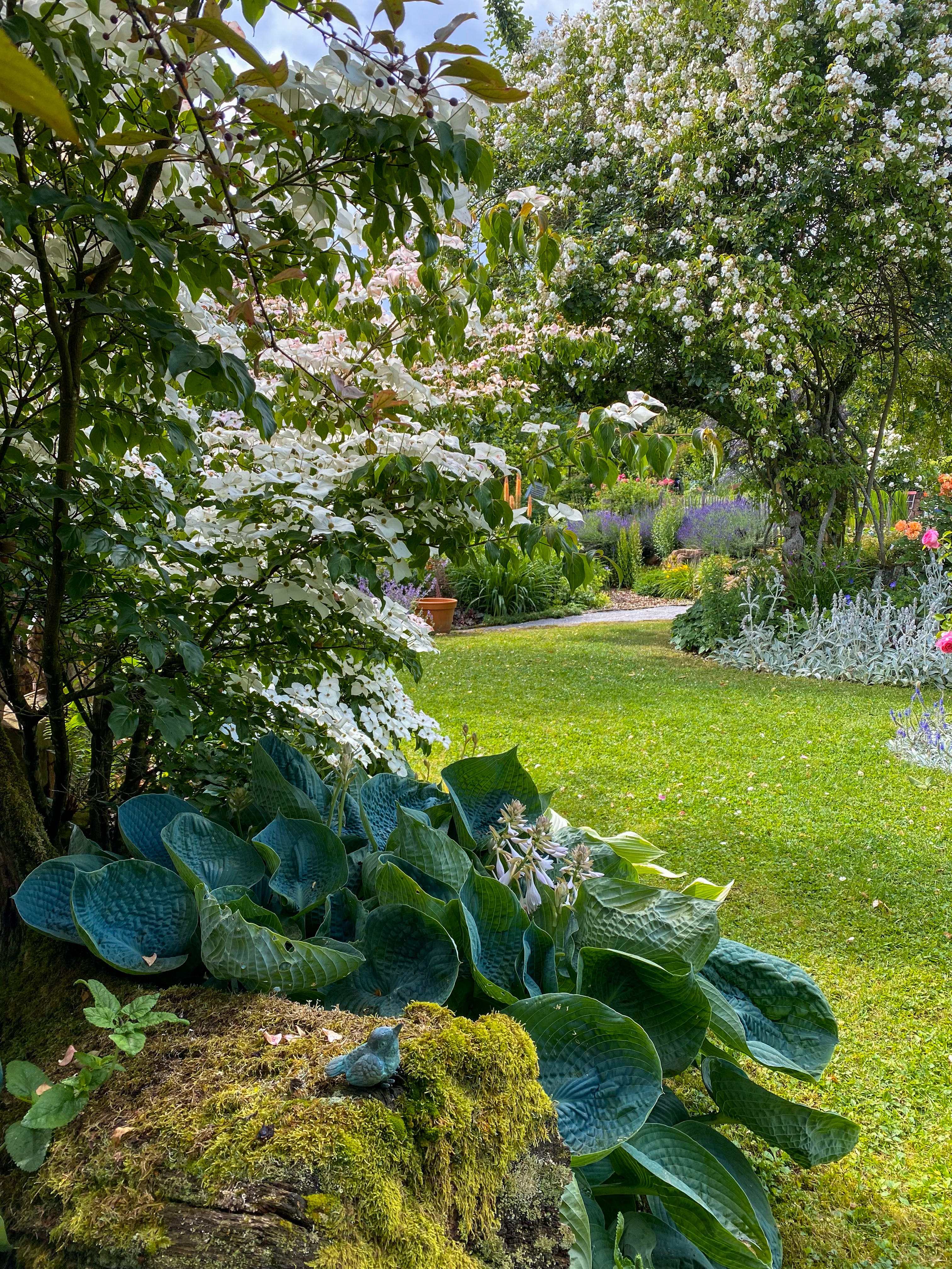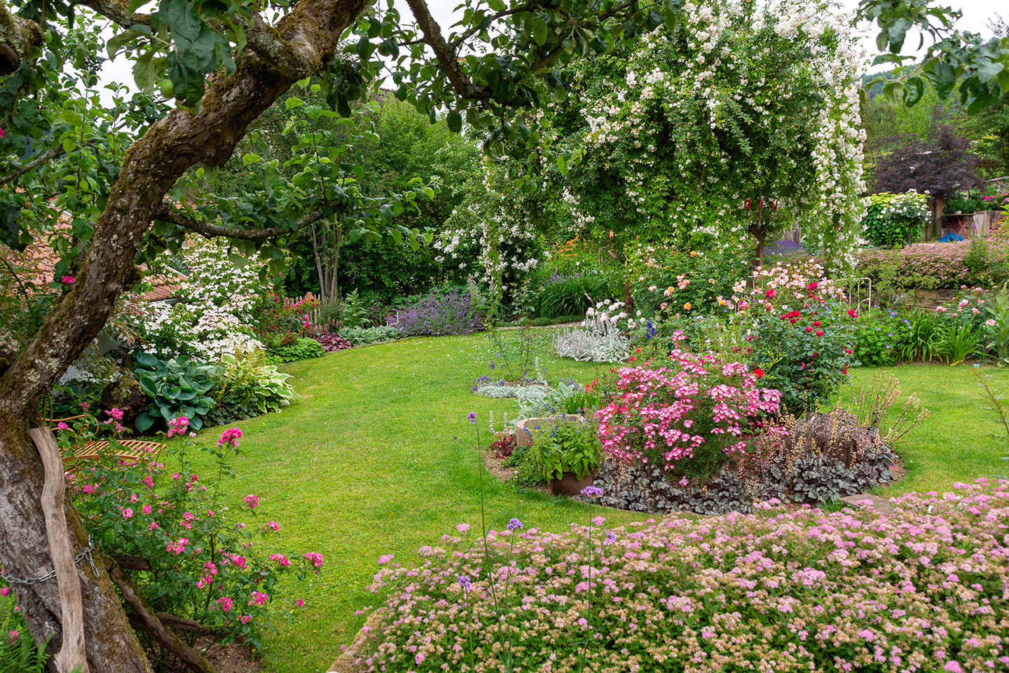 Taglilien, Hortensie Annabelle und links die Kletterrose New Dawn stehen in voller Blüte.